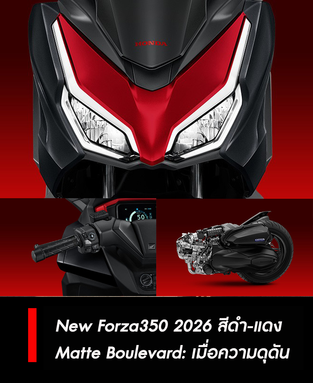 ในการเปิดตัวครั้งล่าสุดของ Thai Honda ภายในงาน Motor Show 2026 ไฮไลท์ที่ดึงดูดสายตาไบค์เกอร์มากที่สุดคงหนีไม่พ้น New Forza350 2026 สีดำ-แดง (Matte Boulevard) ซึ่งเป็นการนำเสนอเฉดสีทูโทนใหม่ล่าสุด ที่ยกระดับภาพลักษณ์จากรถหรูให้มีความเป็นสปอร์ตเรซซิ่งมากยิ่งขึ้น